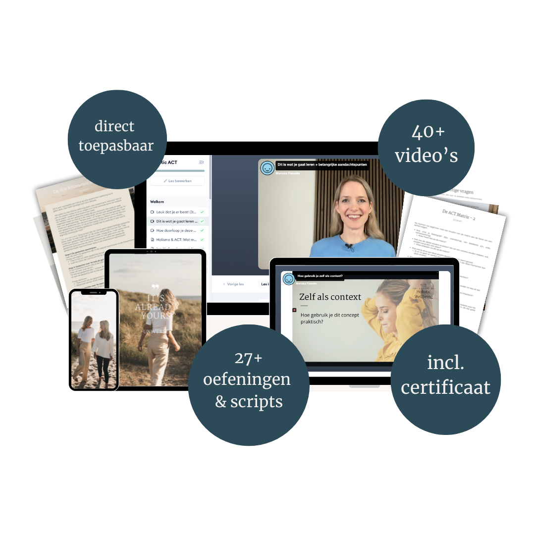 ACT is een wetenschappelijk onderbouwde methode uit de gedragspsychologie. Het helpt je — en je cliënten — omgaan met stress, negatieve gedachten en emoties. Niet door ze te elimineren, maar door er anders mee om te gaan.