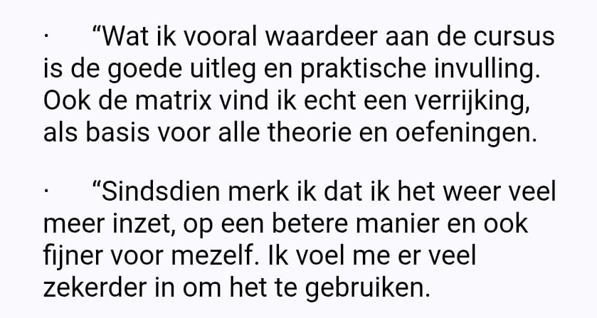 Ja. De informatie en oefeningen die worden aangereikt, doorloop je in eerste instantie voor jezelf. Zo ervaar je wat je eigenlijk vraagt van je cliënten / klanten. Hoewel we ons qua taalgebruik in eerste instantie richten op mensen die het in hun vak willen gebruiken, kun je het dus ook lekker voor jezelf doorlopen