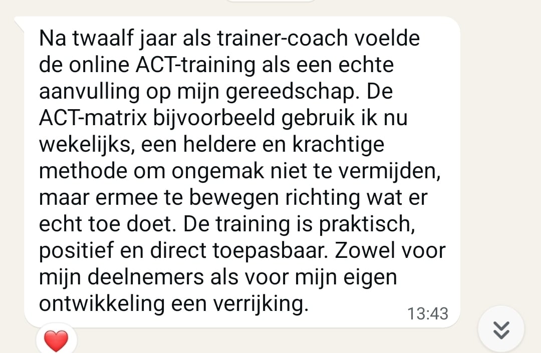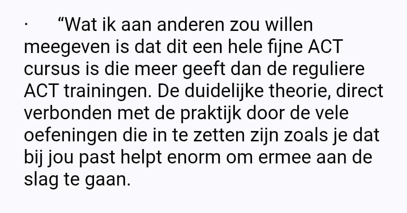 "Ik was al tijden benieuwd naar ACT, maar de meeste trainingen waren te tijdrovend. Deze cursus is zó toepasbaar. Dikke aanrader!"